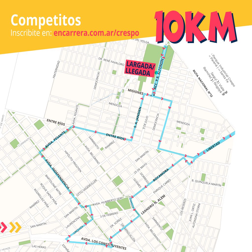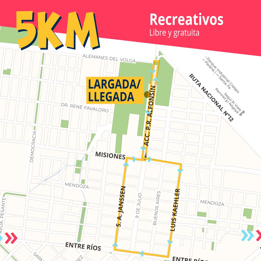La largada será en conjunto en el Acceso Alfonsín, para luego ir uniendo estas calles: Misiones, Kaehler, Entre Ríos, San Arnoldo Janssen, Misiones y Acceso Alfonsín hasta los torreones del pórtico donde realizarán la rotonda y afrontarán los últimos metros hasta la llegada.